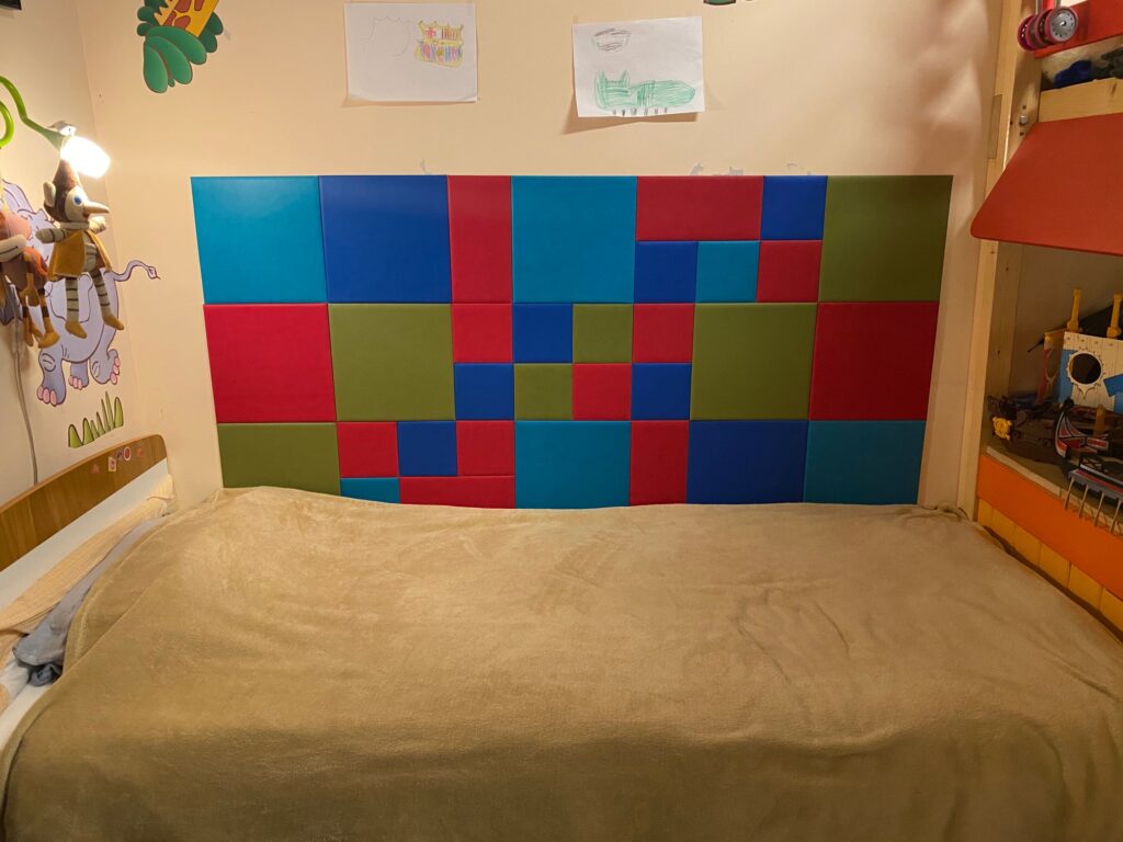 Fali panelekből készült „képet” raktunk fel egy gyerekszoba ágy mögötti falára fali szőnyeg helyett. A szülök egy adott mintázatot vásároltak meg, de végül a kialakult „képet” a szoba tulajdonosa rendezte. A felrakásban is segített, ami így csak egy órát tartott.